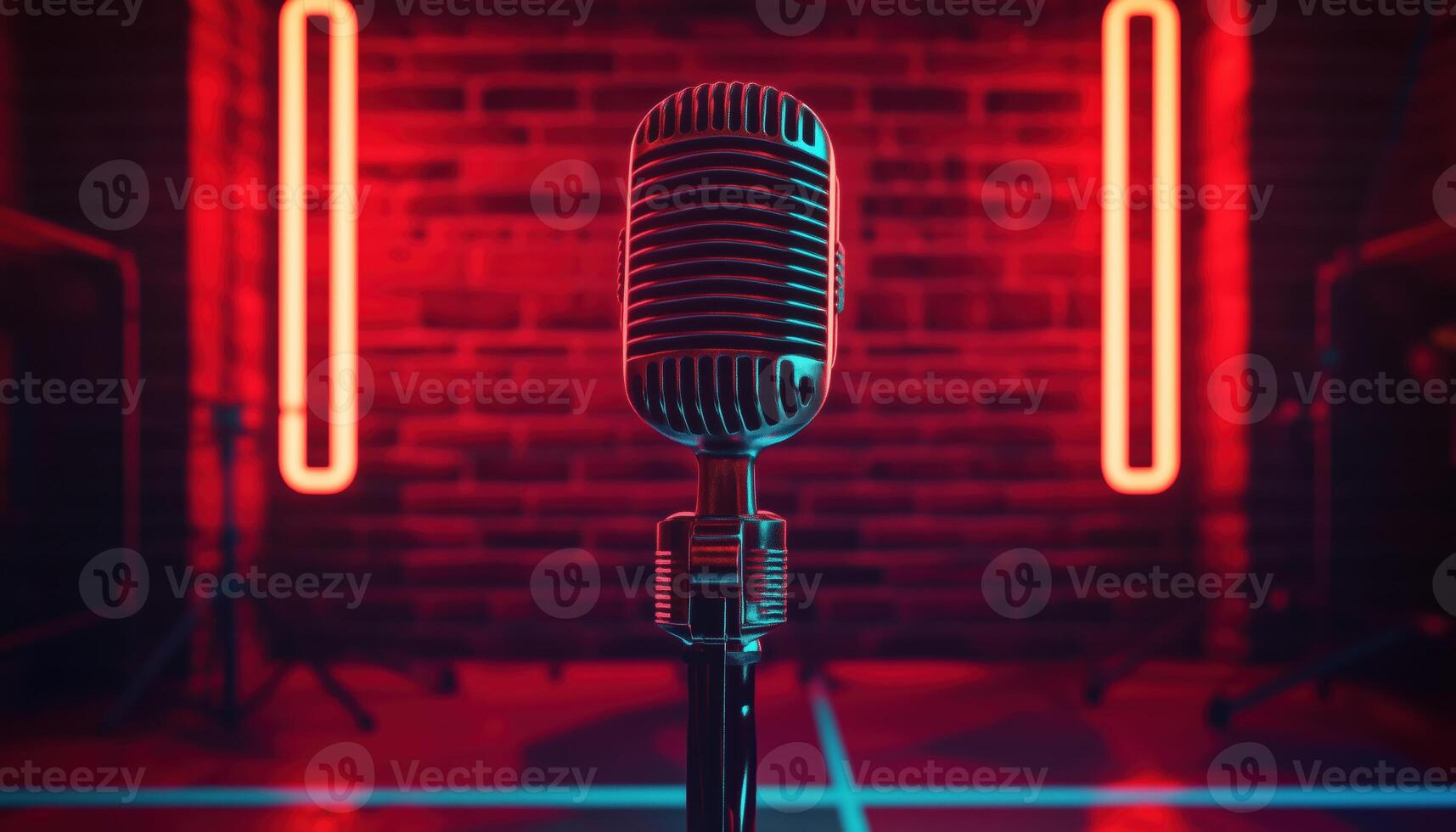 Red And Blue Neon Lights Enhance This Studio Microphone, Creating A Vibrant And Dynamic Look. Ample Space Is Available For Rendering Projects Pro Photo