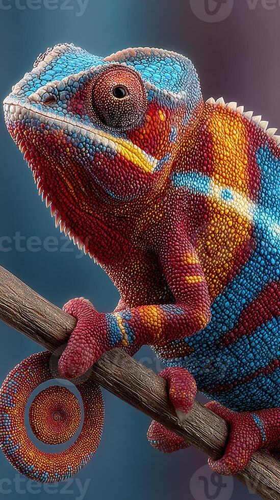 Colorful chameleon perched on a branch in a tranquil setting showcasing vivid patterns and textures in nature Pro Photo