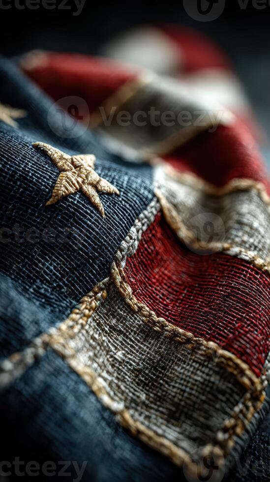 Close-up view of a textured American flag highlighting its detailed fabric and stitching in a warm, soft light Pro Photo