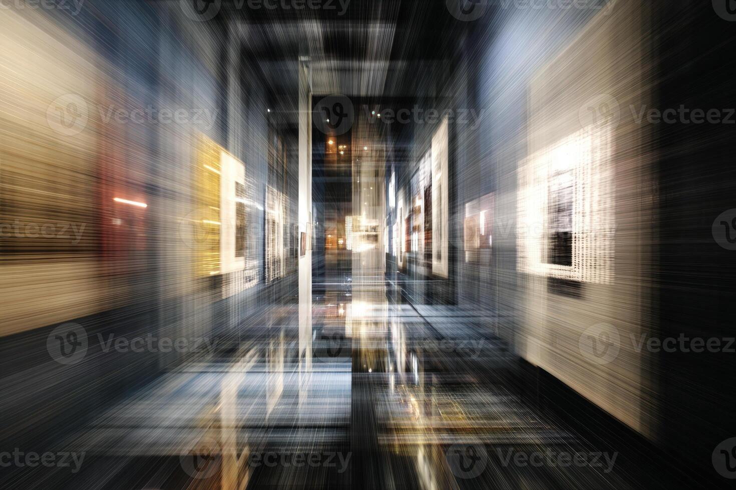 Dynamic motion blur effect in a corridor filled with illuminated artworks. The blurred lines create a sense of speed and modernity, enhancing the visual intensity Pro Photo