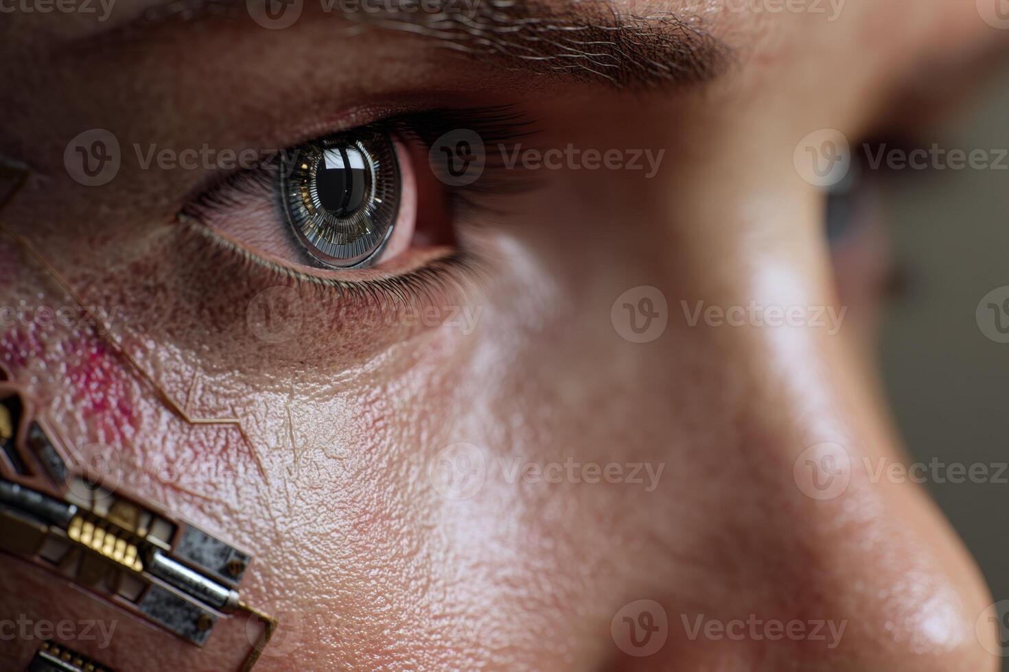 Close-up of a human eye with mechanical elements embedded in the skin, showcasing a blend of organic and technological features, highlighting intricate circuitry and a lifelike iris Pro Photo