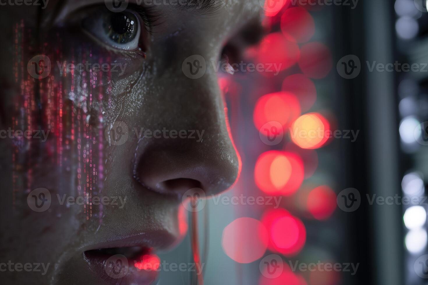 A close-up of a person's face with digital code projected on their skin, eyes wide open. Red and white bokeh lights blur in the background, adding a futuristic feel Pro Photo