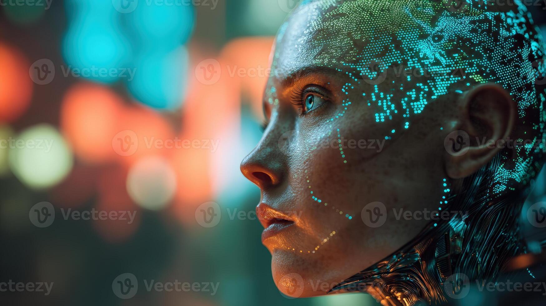 A humanoid figure with illuminated digital patterns gazes forward, blending human and futuristic technology elements. The scene exudes a cybernetic and futuristic atmosphere Pro Photo