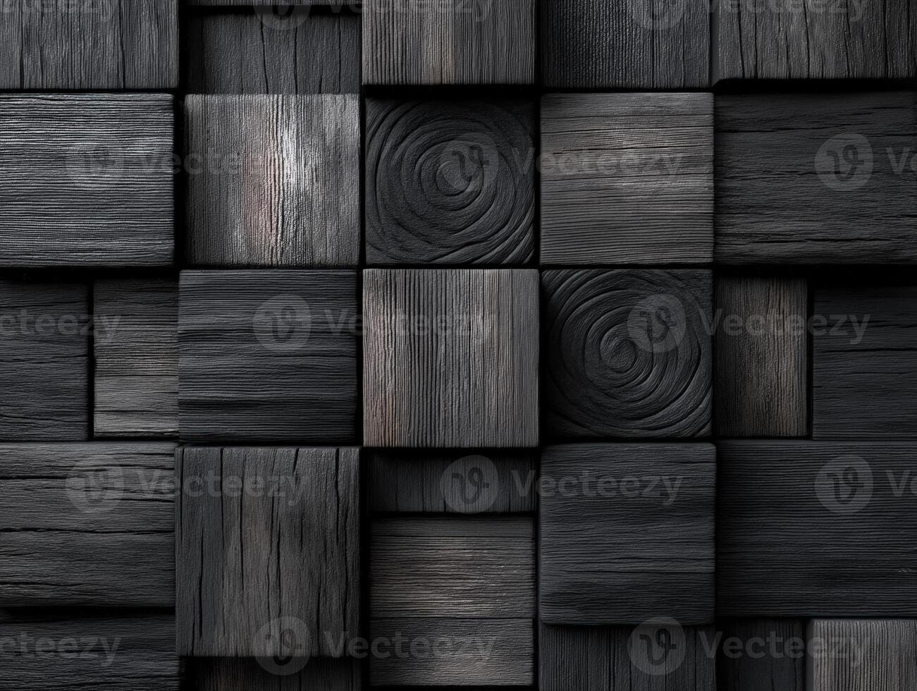 Dark wooden squares with varied textures and grain patterns form a geometric mosaic. The wood ranges from smooth to rough, showcasing spirals and linear details in a seamless composition Pro Photo