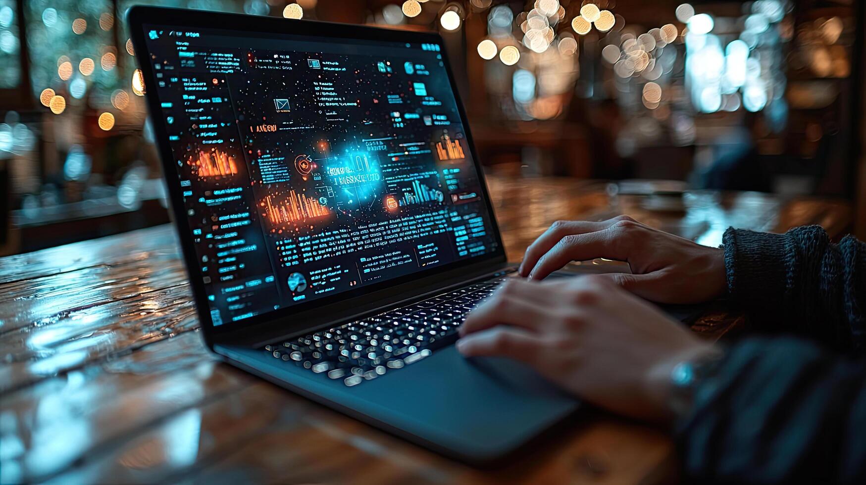 Coding on Laptop with Data Visualization and Bokeh Lights, Programmer at Work, Software Development Concept photo