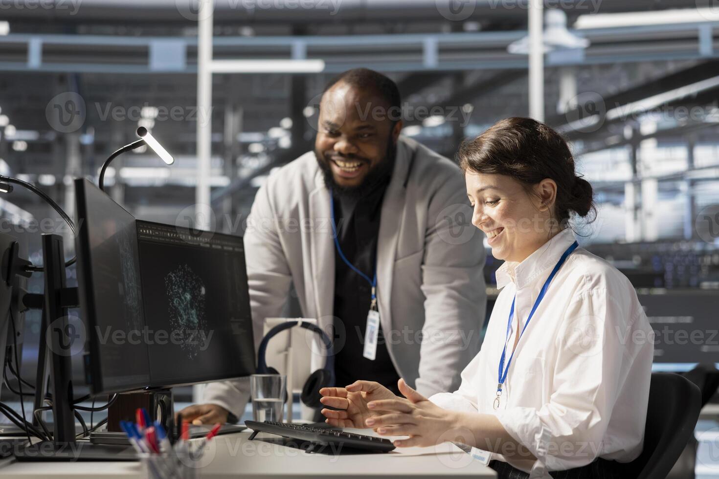 Delighted data center team leader reacting with satisfaction after seeing improved system efficiency metrics. Manager satisfied with enhanced equipment performance after finishing update Pro Photo