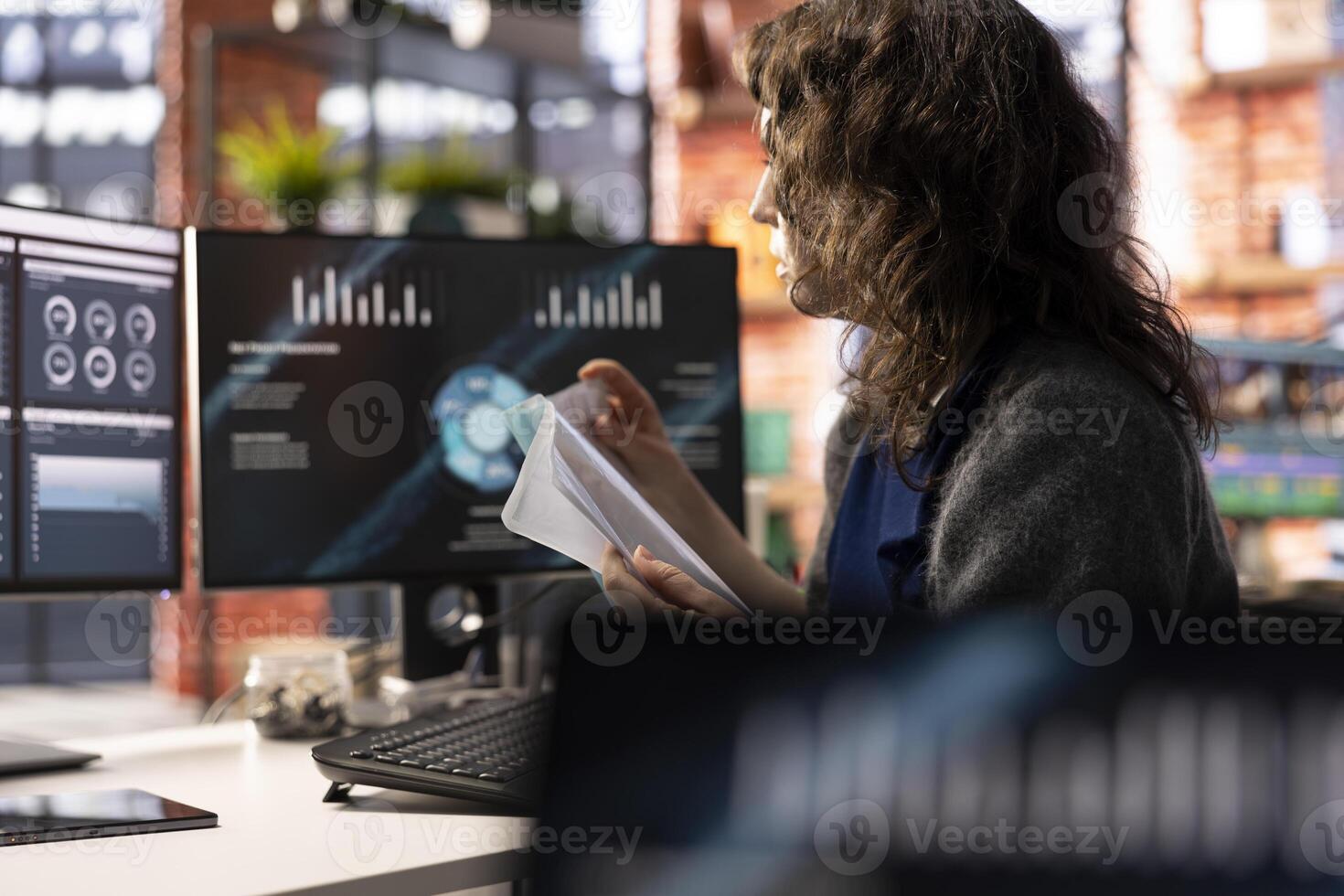 Remote worker at home watching business conference on PC monitor, writing down info on her notebook. Freelancer in office looking at presentation graphs on computer, taking notes. Pro Photo