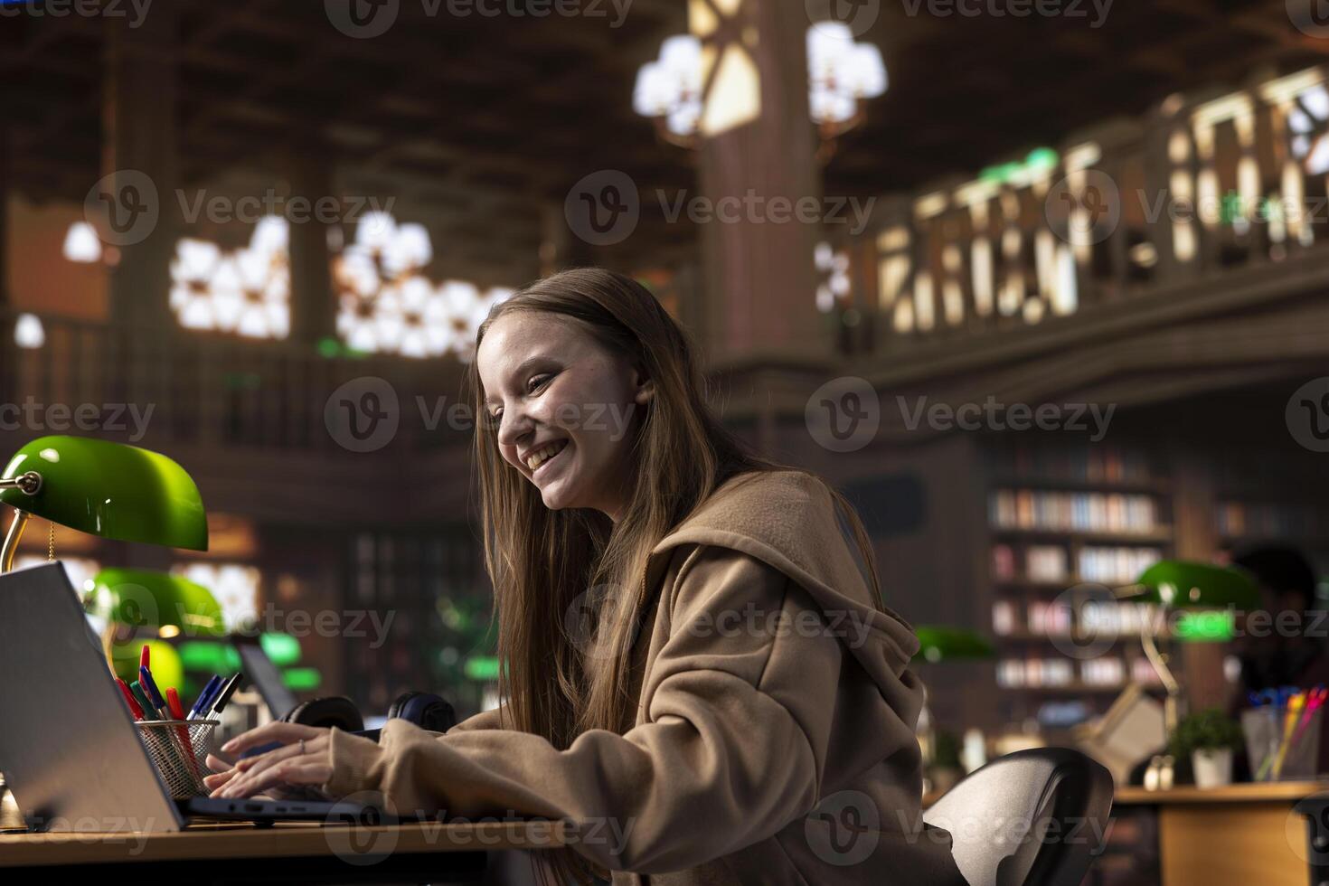 Confident student gathers information and citations from reliable sources via university library massive database, working on bachelor degree paper. Intelligent girl working for a certificate. Pro Photo