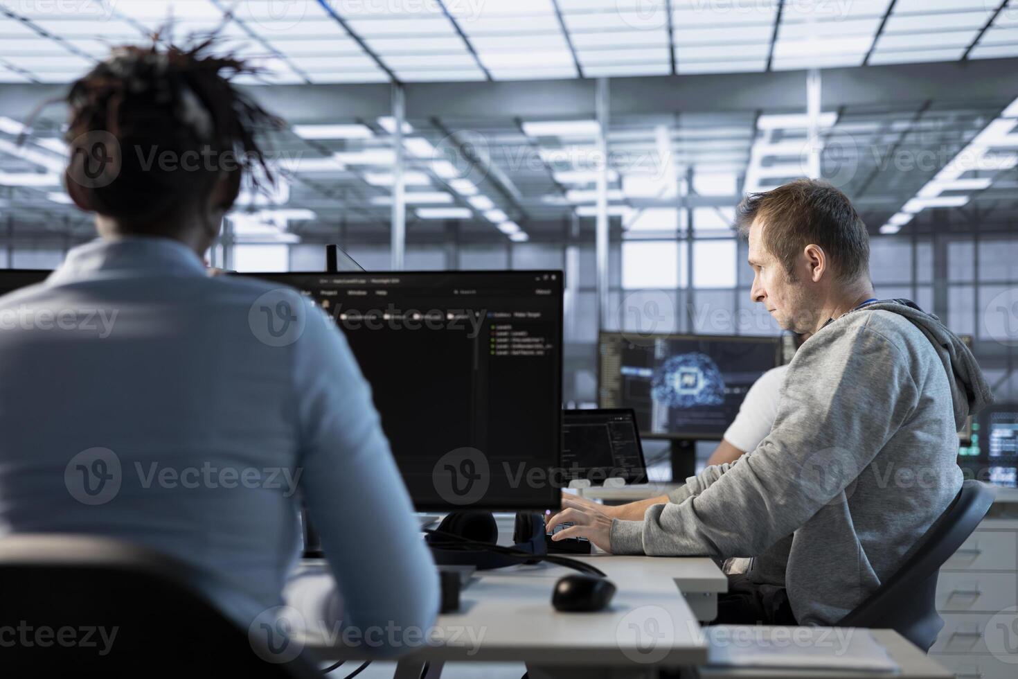 AI technician at work in high tech server room analyzing data on monitors, ensuring seamless data flow. Man in artificial intelligence data center, ensuring system integrity and security Pro Photo