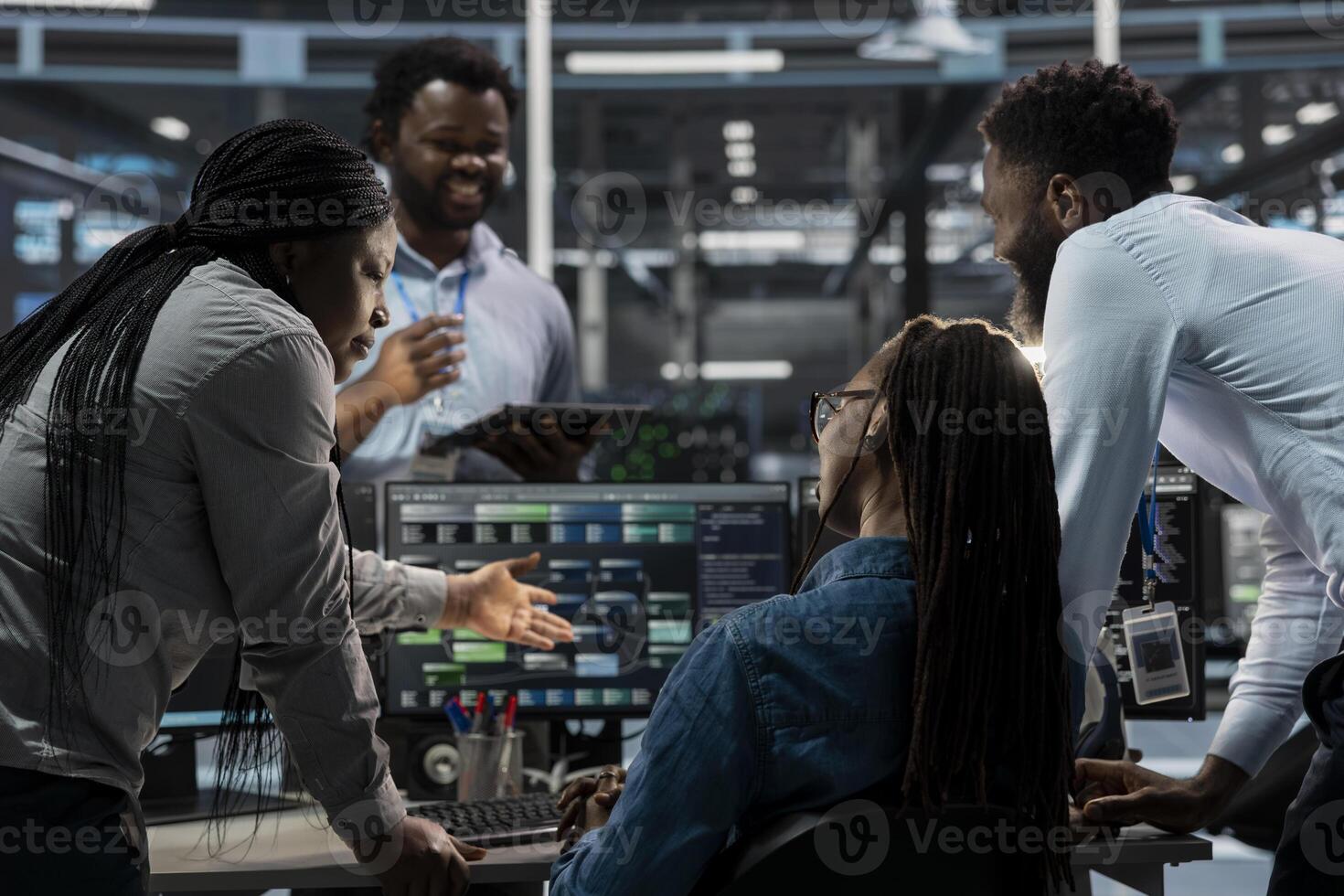 Coworkers programming in server farm housing advanced infrastructure storing massive datasets. Admins running code on PC to repair data center racks doing complex computational operations Pro Photo