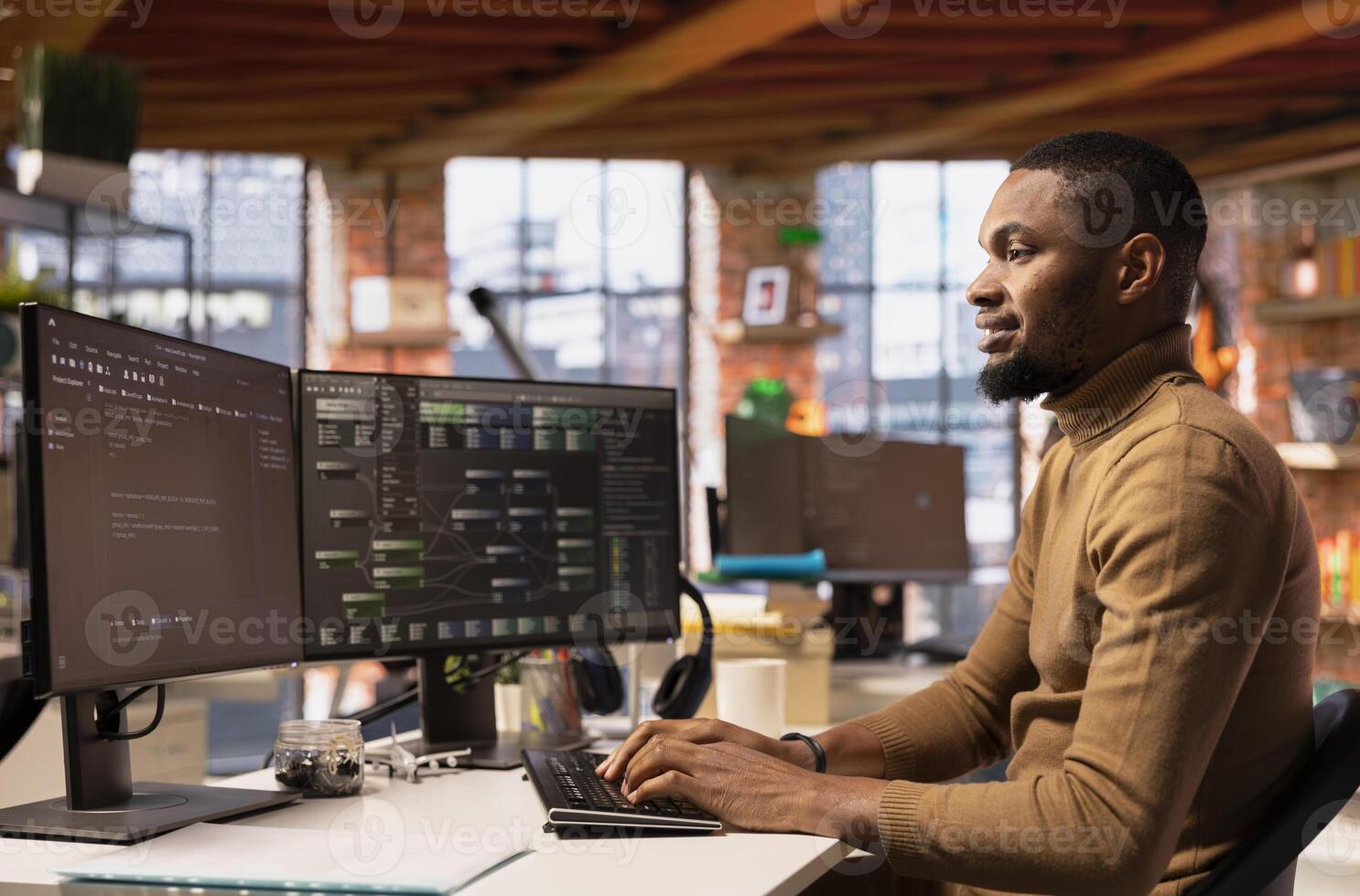 Upbeat software engineer coding advanced AI algorithm and machine learning models enhancing automation. Jolly IT worker using computer in innovative Silicon Valley workplace Pro Photo