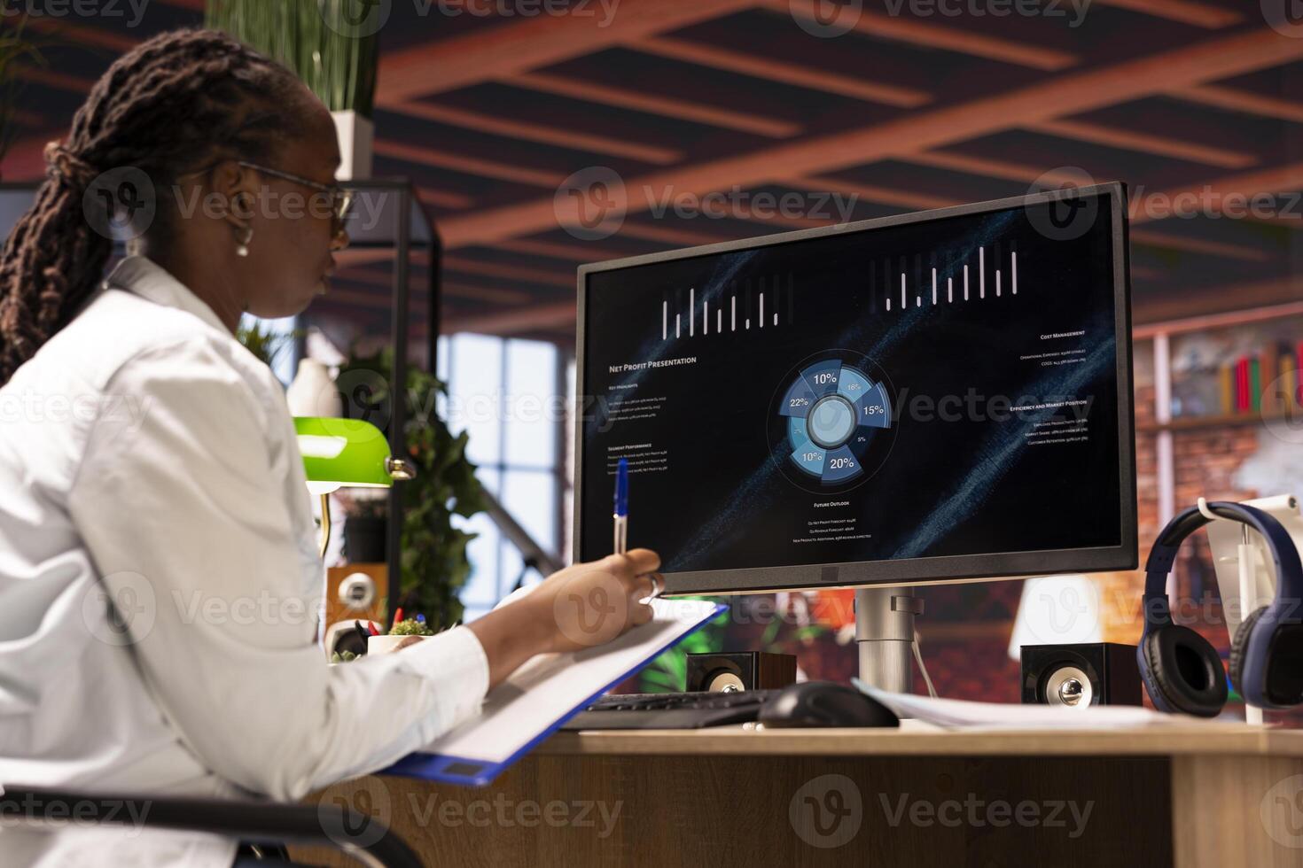 Woman in home office using financial application UI on PC screen showing company revenue and expenses. Accountant working from apartment doing annual profits review using computer Pro Photo