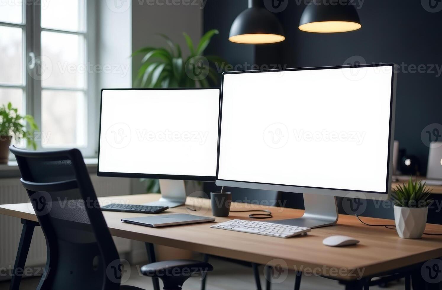 Modern workspace featuring dual monitors and a minimalist design with greenery during daylight Pro Photo