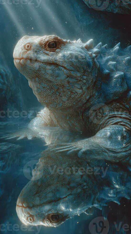 Ancient reptile emerges from water in a mystical cave illuminated by soft light Pro Photo