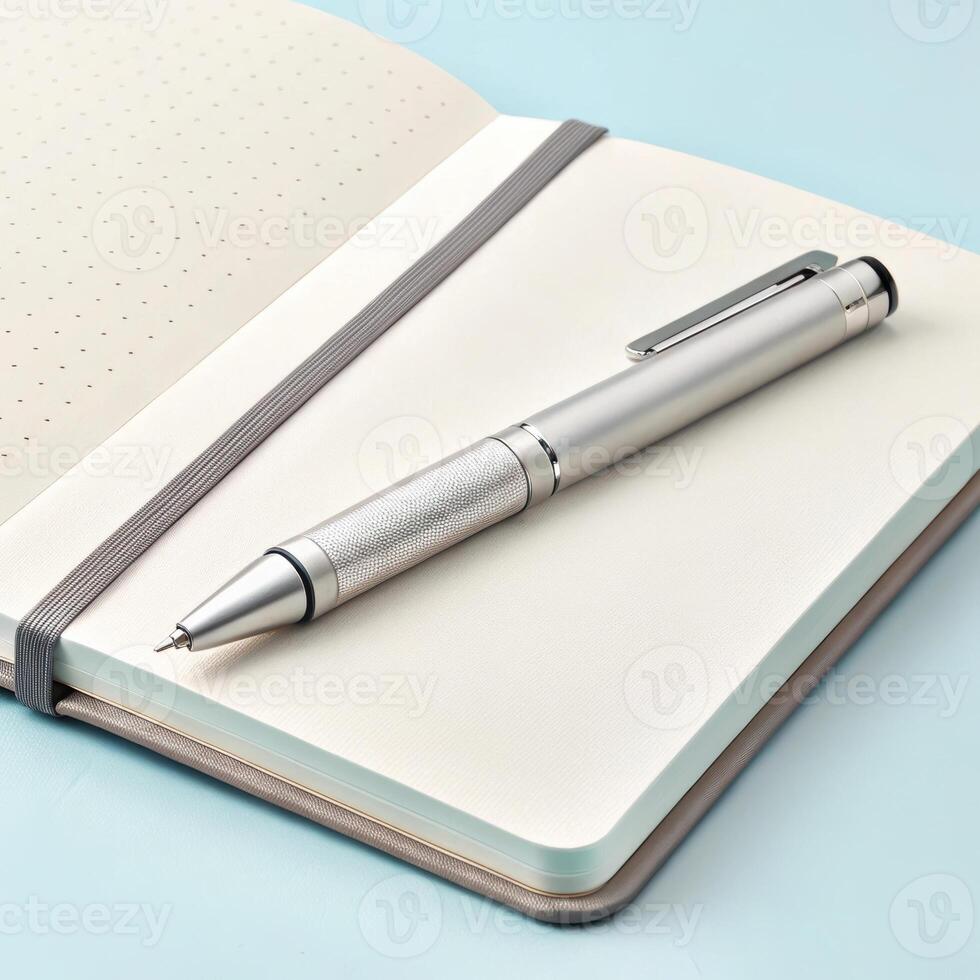 Stylish silver pen resting on open notebook with dotted pages in light blue background with copy space Pro Photo
