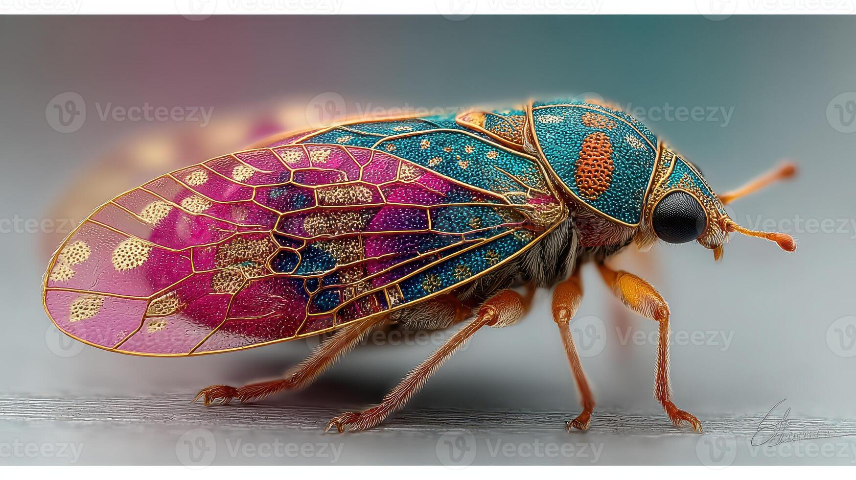 Colorful insect perched on a surface, displaying vibrant patterns and intricate details in a close-up view Pro Photo
