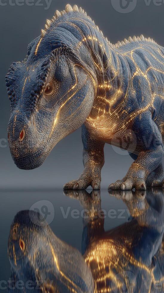 Dinosaur with glowing patterns reflected on a smooth surface in a stylized art setting Pro Photo