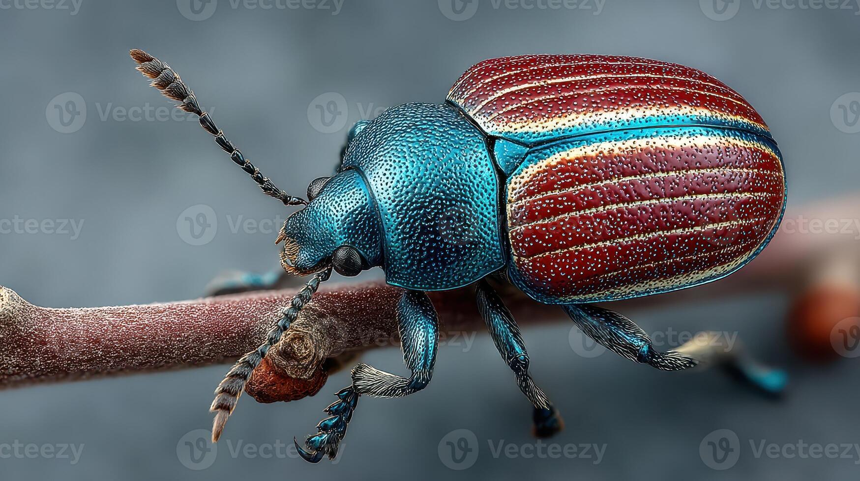 Colorful beetle resting on a twig in a natural setting during daylight Pro Photo