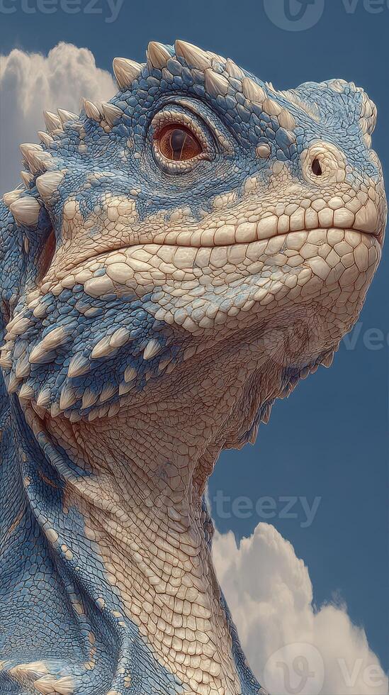 Unique blue lizard displays intricate patterns against a bright sky with clouds during a sunny day Pro Photo
