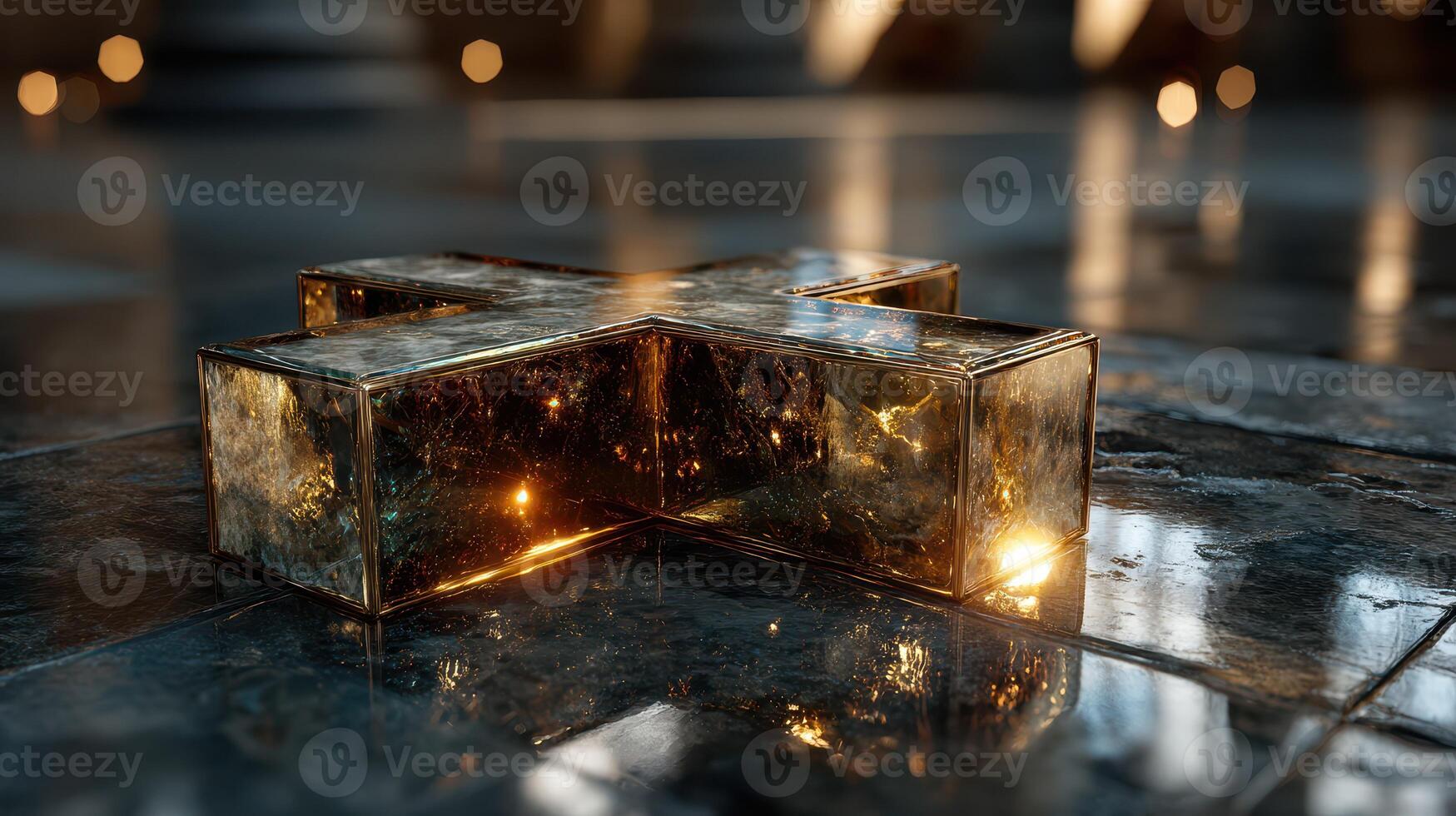 Golden cross resting on polished marble floor in a serene and elegant setting during soft ambient lighting Pro Photo
