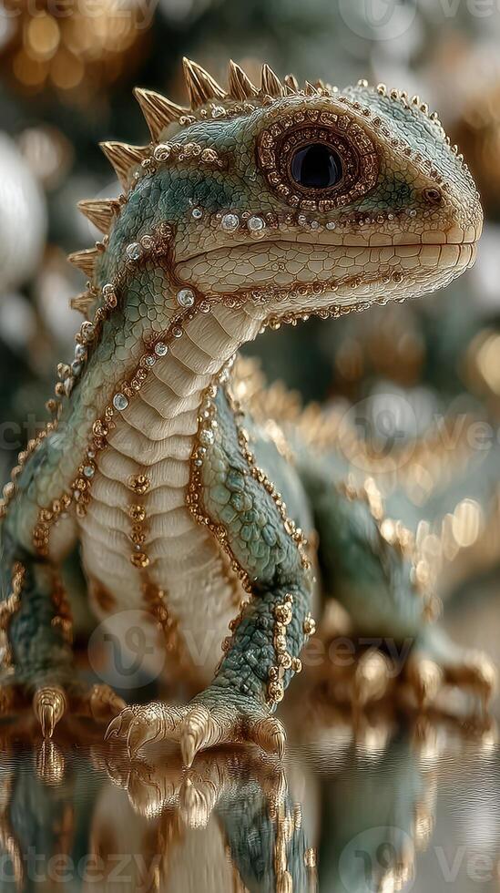 Lizard with intricate details adorned with jewels sits on a reflective surface in a soft-focus background Pro Photo