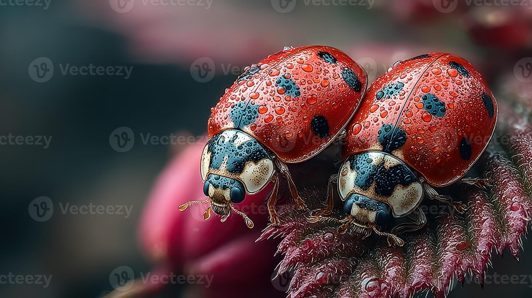 Close-up view of ladybugs resting on wet leaves after rainfall in a lush garden setting during springtime Pro Photo