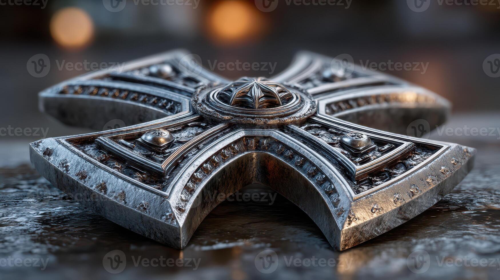 Intricate silver cross emblem displayed on textured surface with soft lighting in an artistic setting Pro Photo