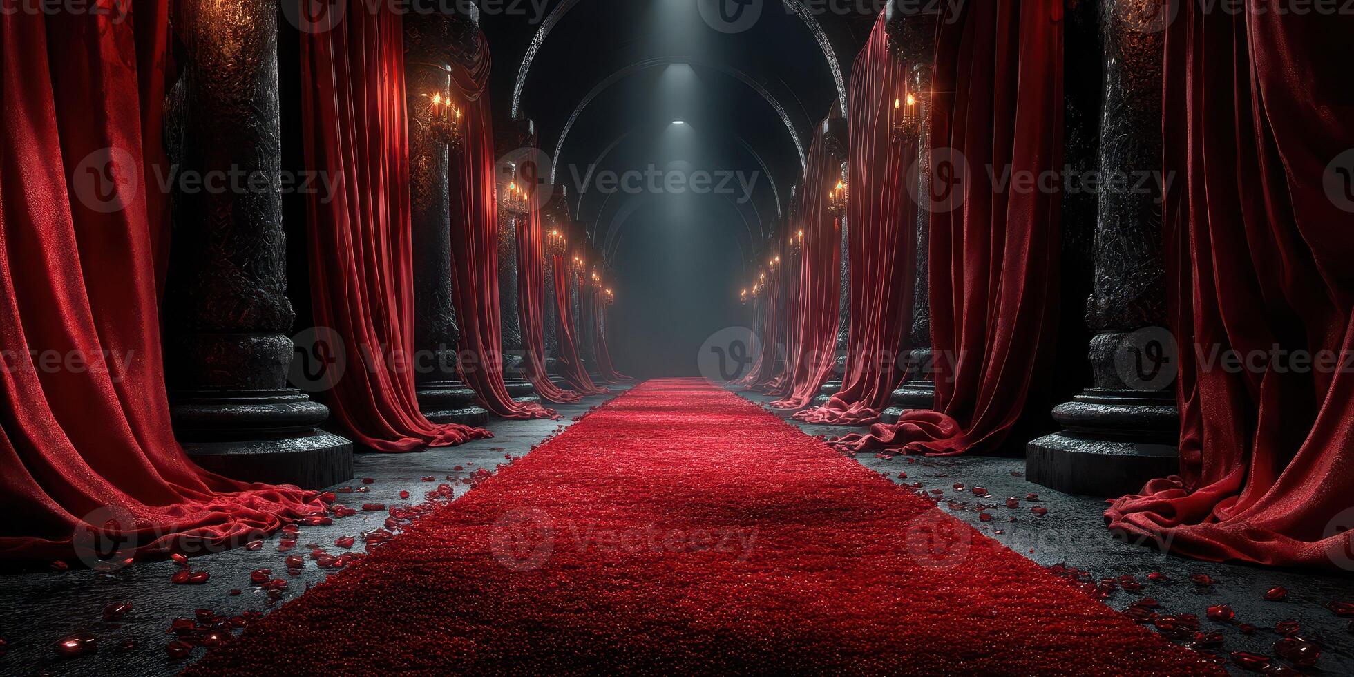 Elegant red carpet hallway with dramatic draping and soft lighting creating a luxurious atmosphere for an event Pro Photo