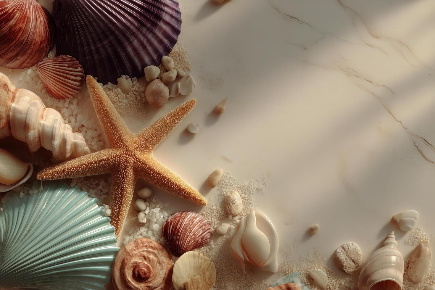 Colorful Shells and Starfish Arranged on Sandy Surface With Gentle Light photo