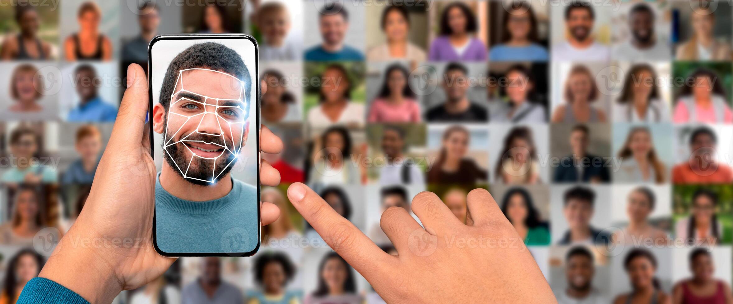A user scans a face using a smartphone, highlighting the capabilities of modern identification technology. Background features diverse portraits showing various people engaged in similar activities. Pro Photo