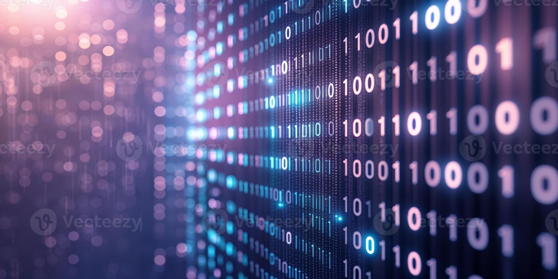 Digital binary code streams lighting up a dark background during a tech-themed event at night Pro Photo