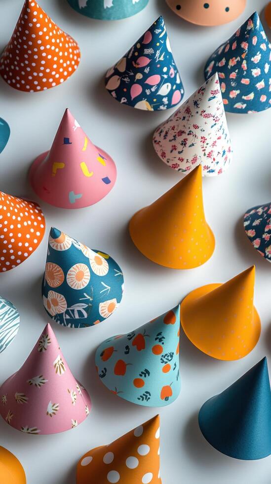 A whimsical array of patterned party hats scattered on a clean white surface above view photo
