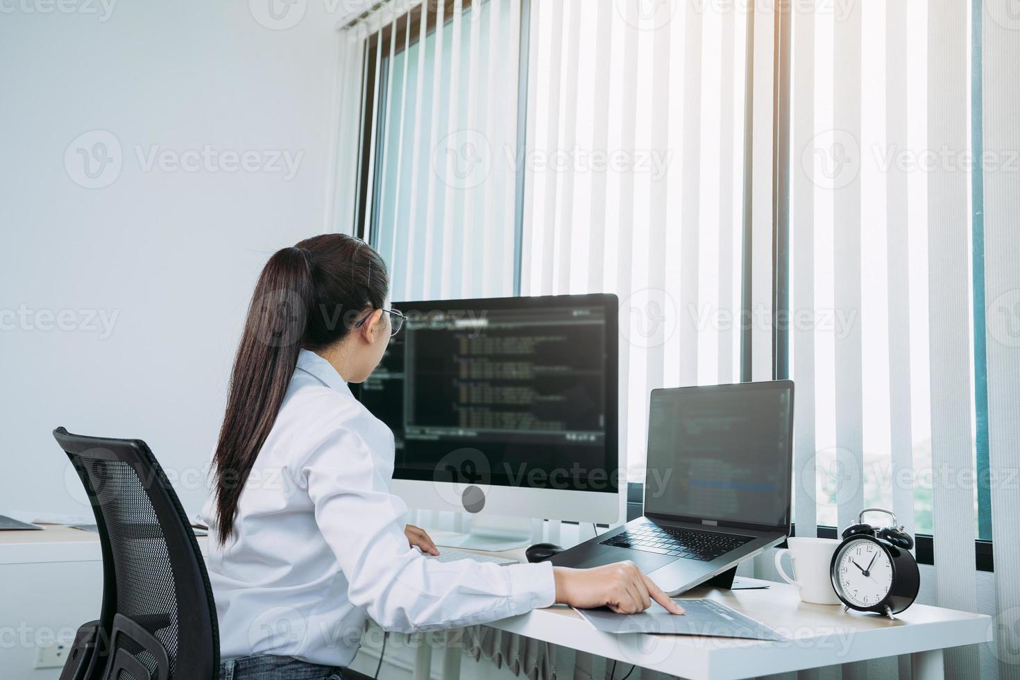 Woman asian software developers are analyzing together about the code written into the program on the computer in office room. Pro Photo