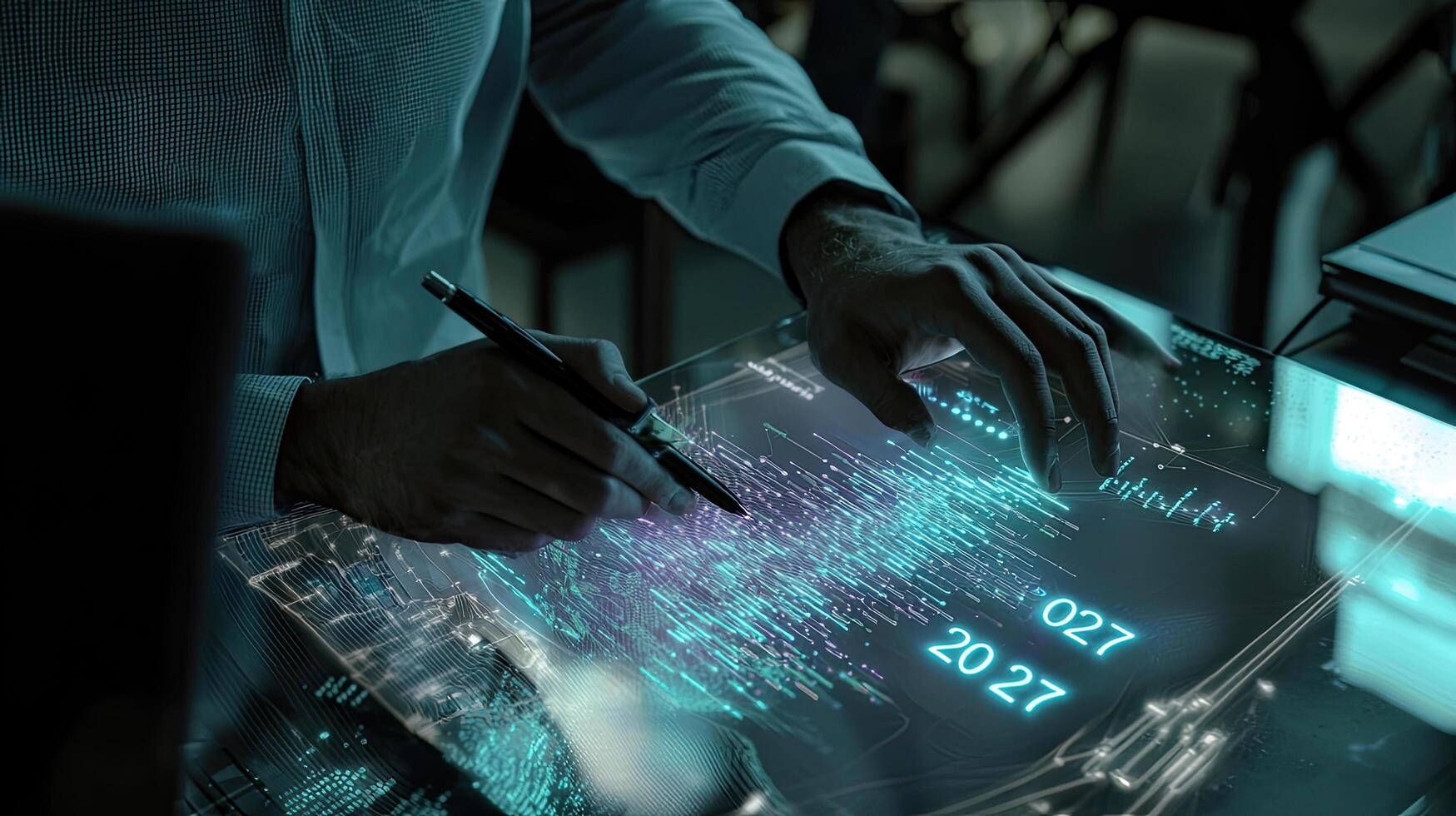 Futuristic Technology Analysis Business Professional Analyzing 2027 Projections on a Digital Interface with Advanced Data Visualization Free Photo