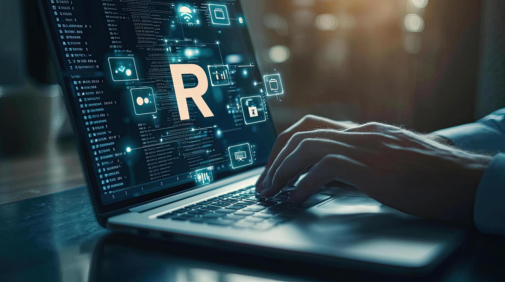 Coding with R Language on Laptop Display with Hand Typing, Software Development and Data Science photo
