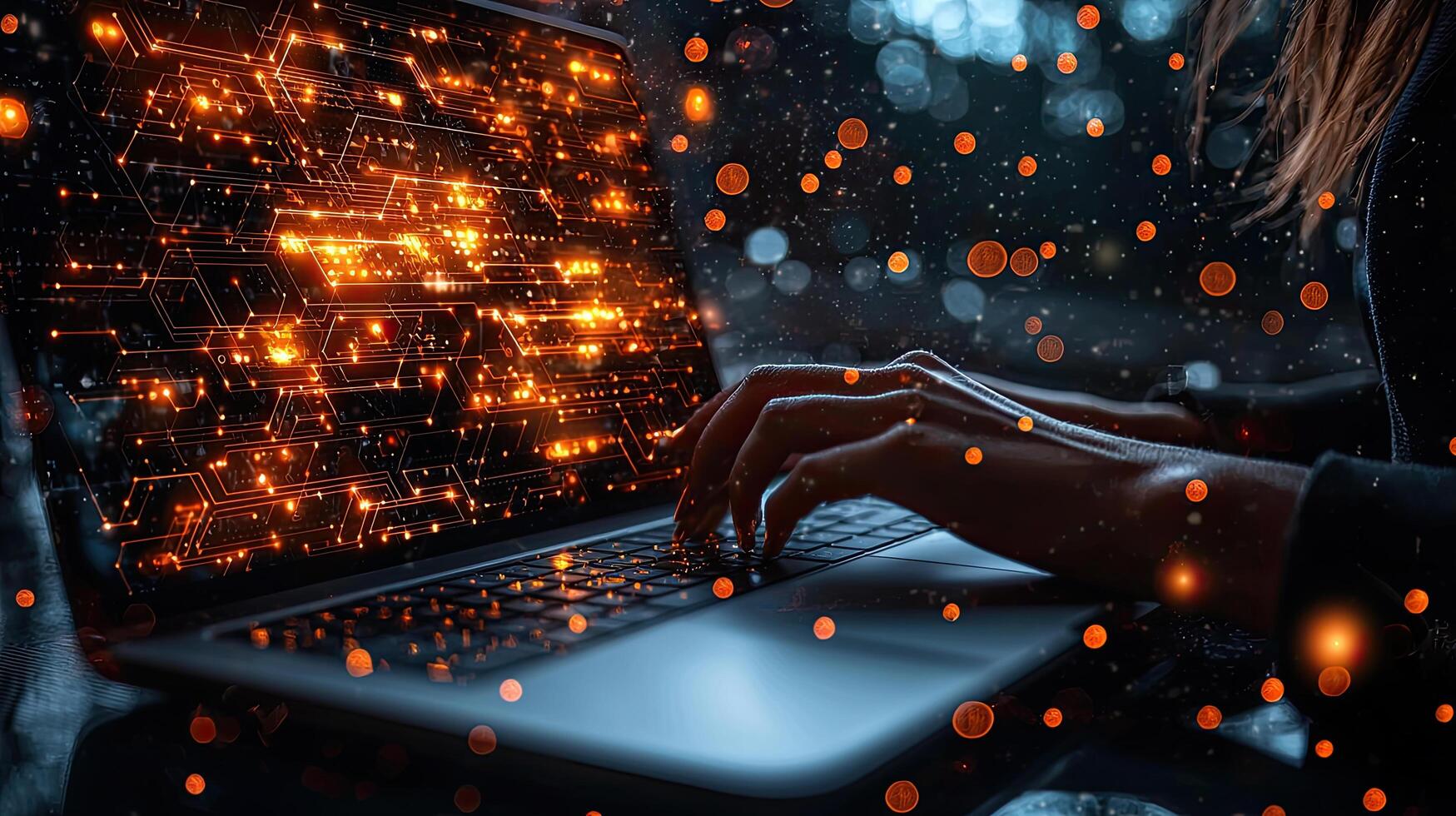 Digital Circuit Laptop Coding Woman Typing with Flowing Data Visualization for Cybersecurity and Technology Concepts Free Photo