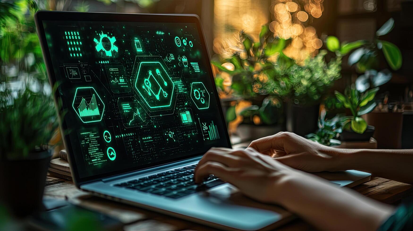 Digital Innovation CloseUp of Laptop Screen Displaying Futuristic Technology Interface with User Typing, Data Analysis and Technology photo