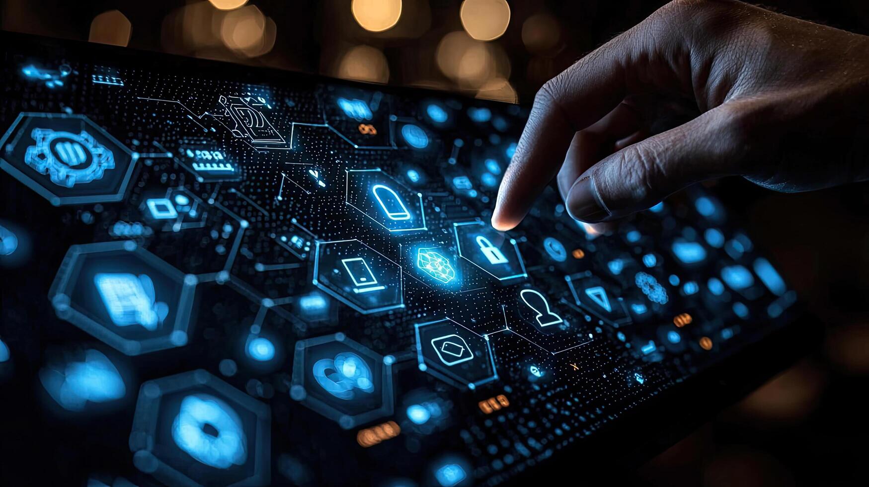 Finger Touching Secure Digital Interface Cybersecurity, Cloud Computing, Data Encryption, and Network Protection Concept photo