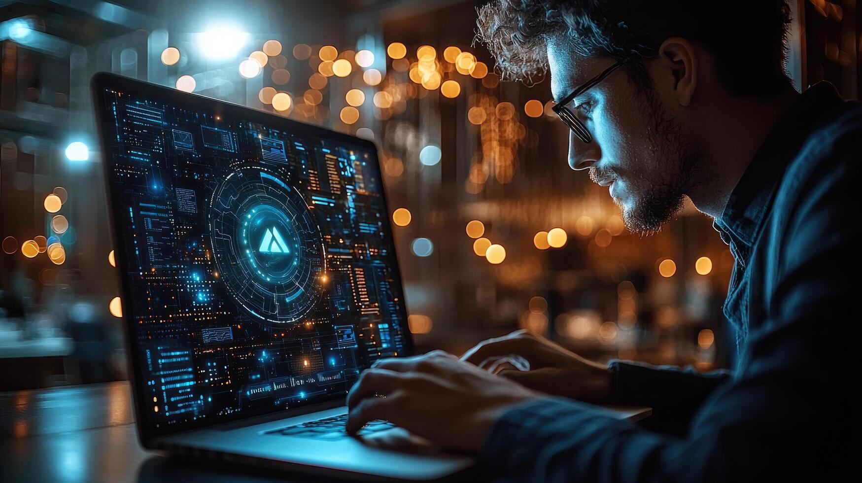 Focused Man Coding on Laptop with Digital Interface Displaying Futuristic Technology and Bokeh Lights Backdrop photo
