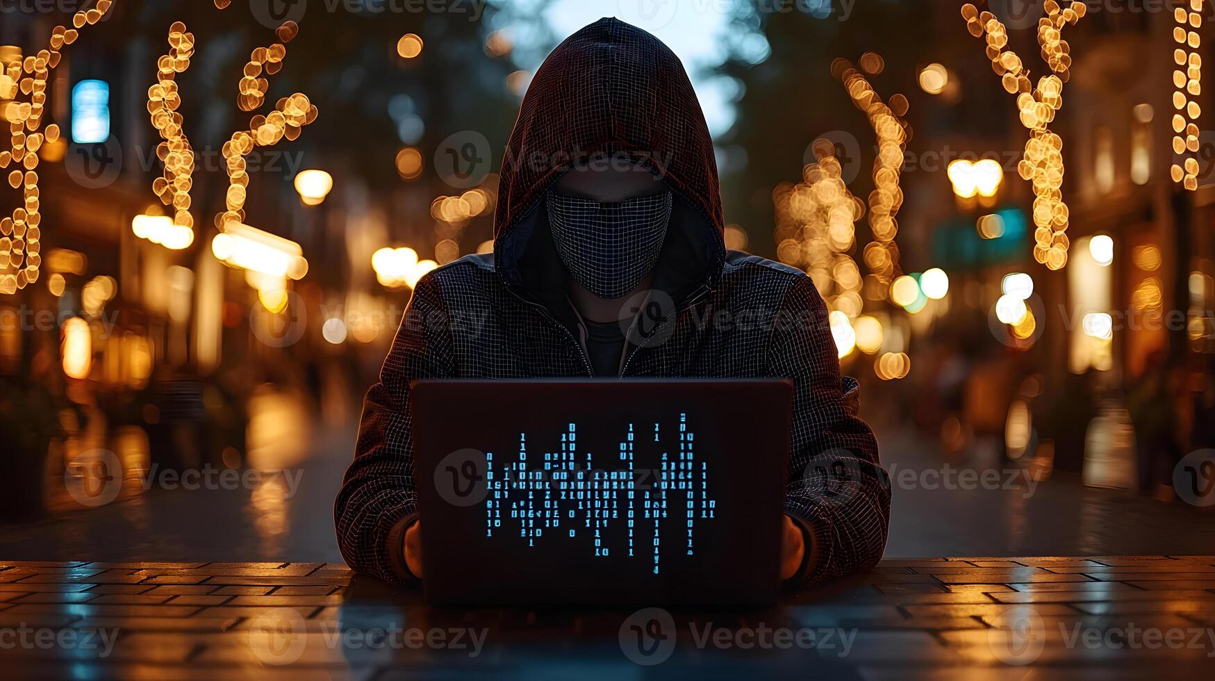 Mysterious Hooded Hacker Using Laptop with Binary Code on City Street at Night, Cyber Security Concept Pro Photo