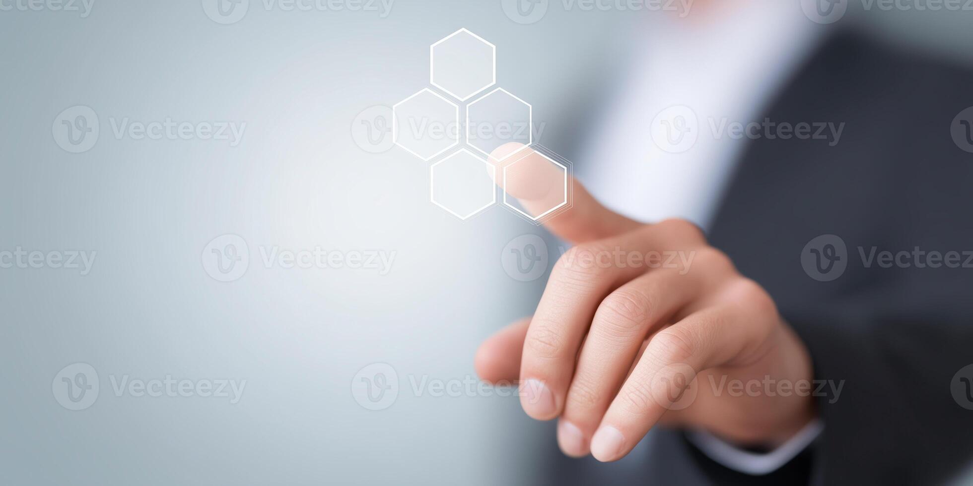 Business professional interacting with digital interface displaying hexagonal shapes and technology concepts for innovation and connectivity concept Pro Photo