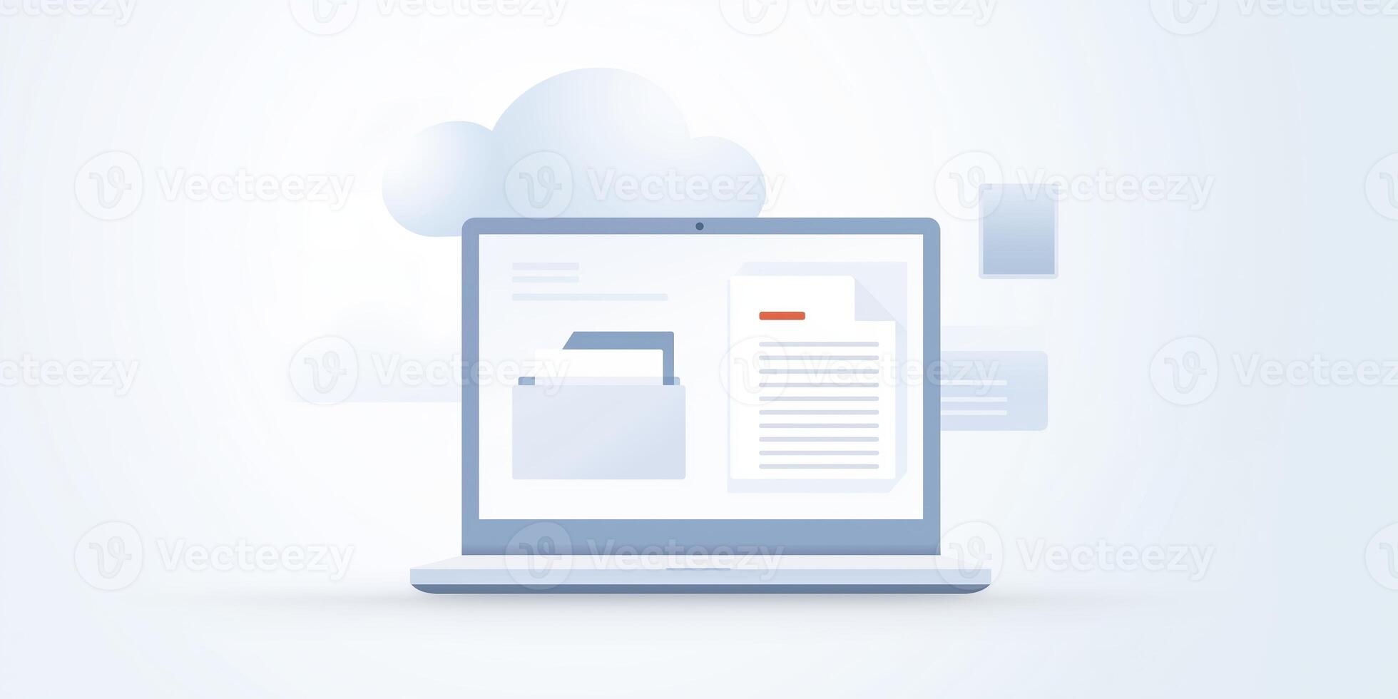 Laptop mock up displaying digital documents and folders with cloud storage concept and soft gradient background for design purposes Pro Photo