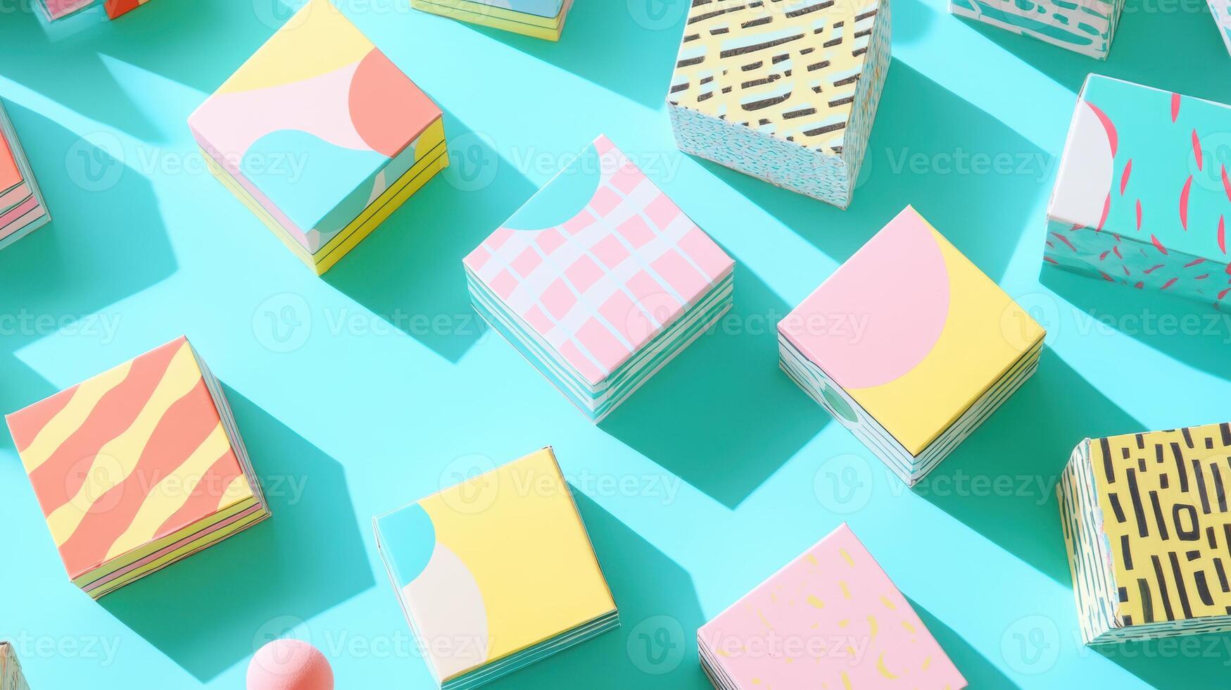Colorful geometric patterns on square boxes create a vibrant and playful design on a bright turquoise background with artistic shadows Pro Photo