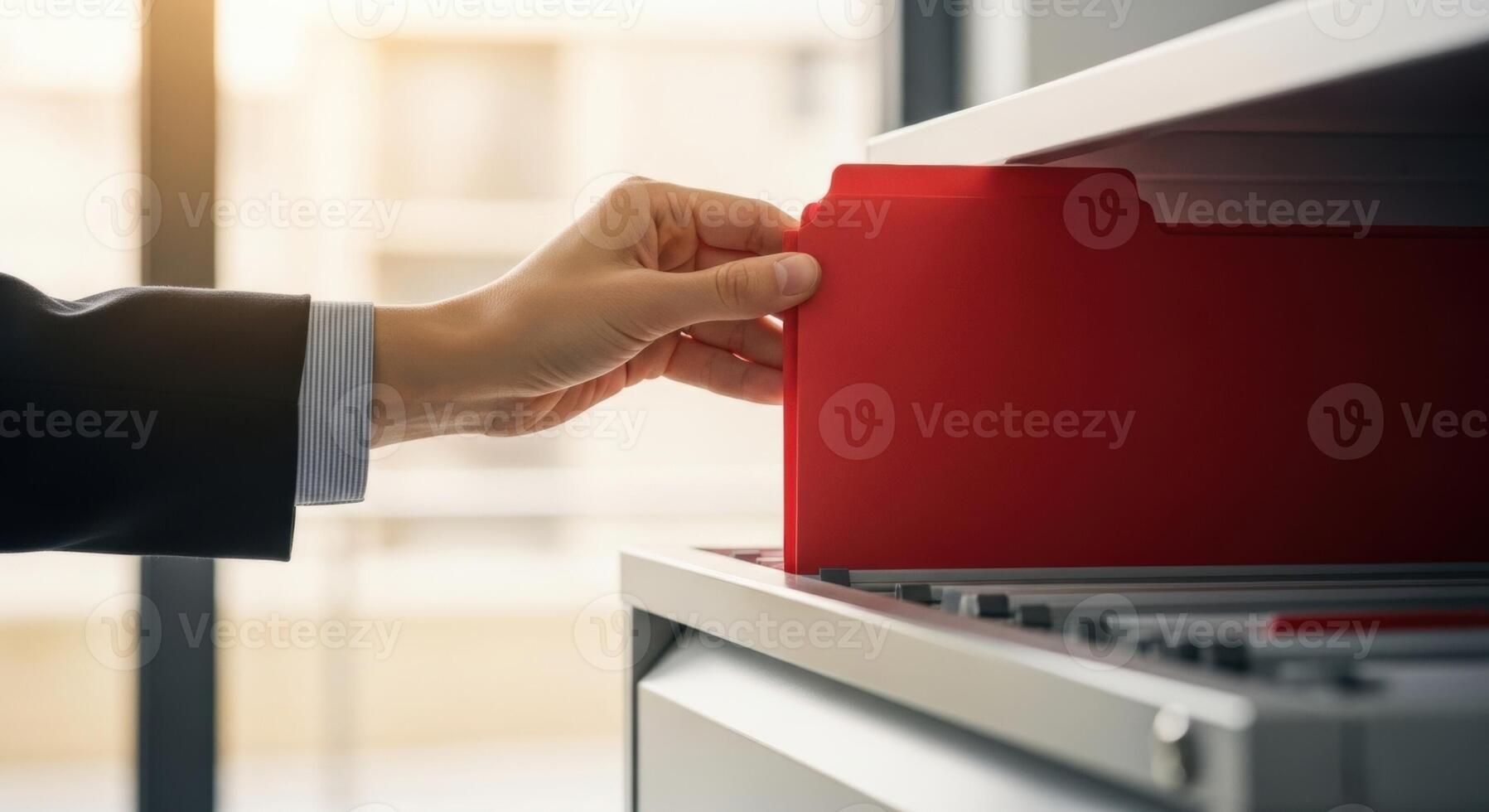 Businessman organizing documents by placing a red file folder into a filing cabinet Pro Photo