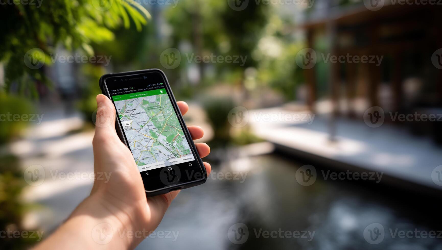 Close-up of a hand holding a smartphone displaying a map app. Green map, blurry background of trees and water feature Pro Photo