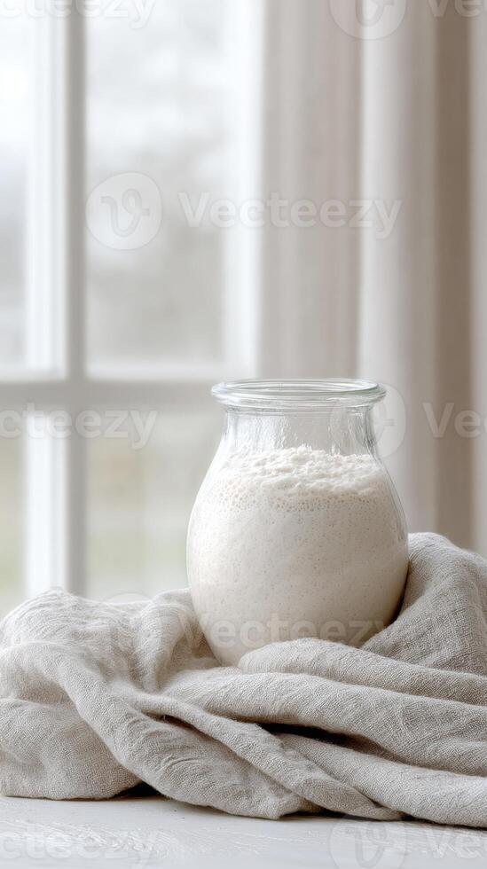 Sourdough starter rises in a glass jar, capturing natural light and creating a rustic baking atmosphere Pro Photo