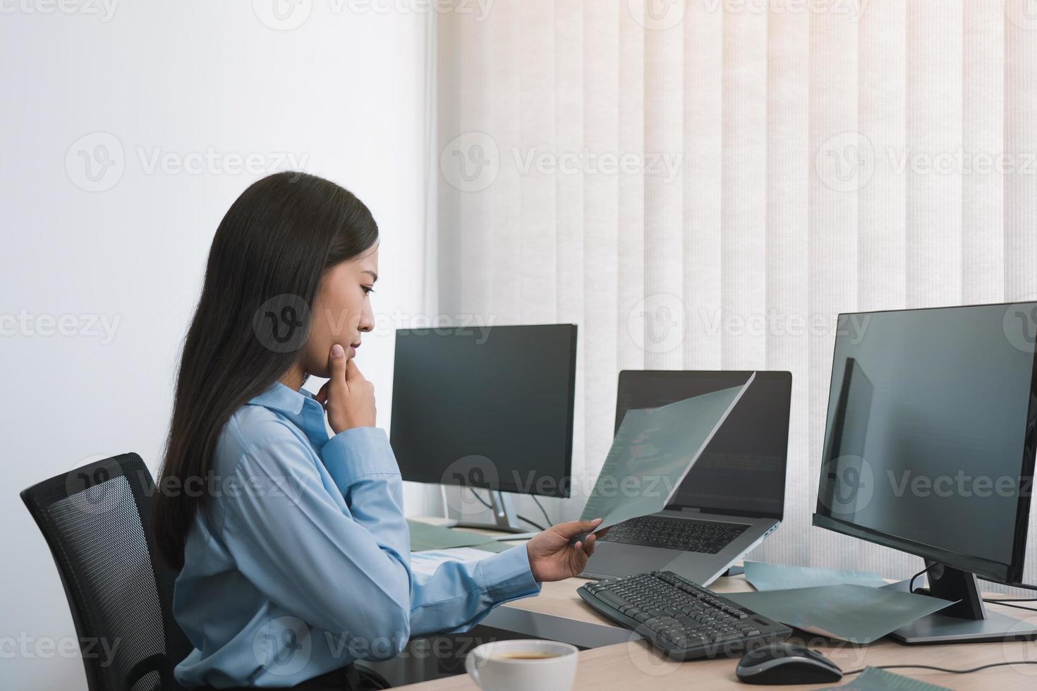 Stress asian woman while coding data programmer on desktop PC while working on computer codes in the office. Pro Photo