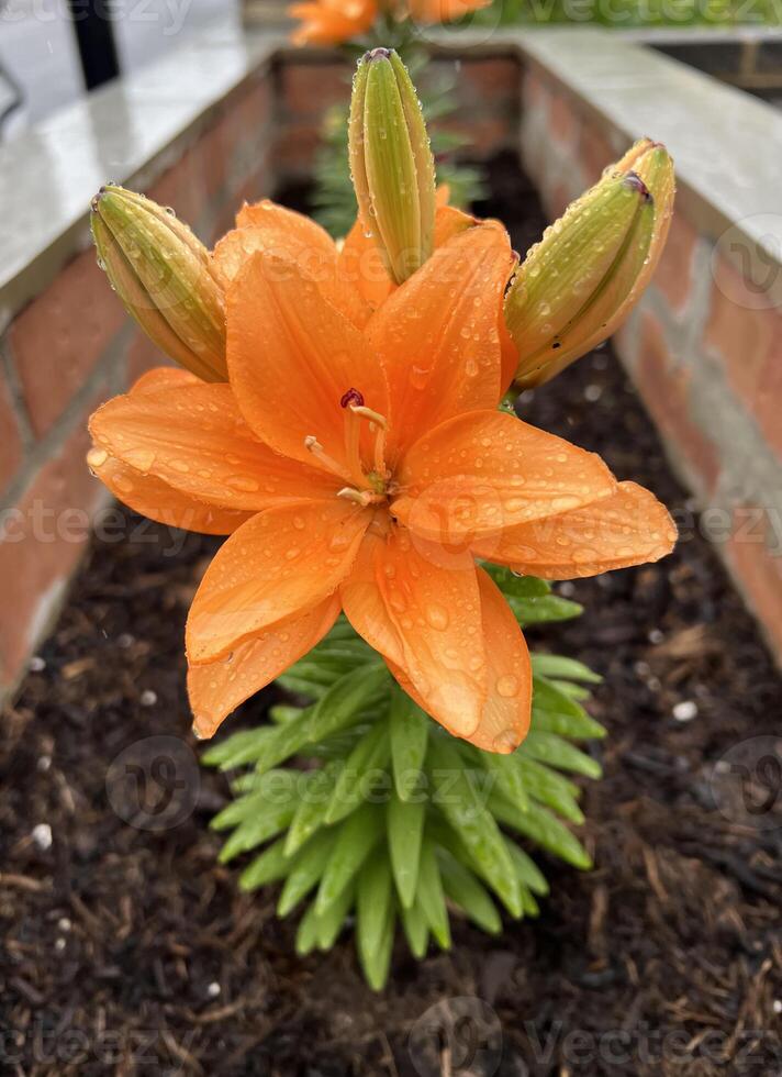Closeup of orange lily in full bloom with water droplets and three closed buds, in a flower bed on a rainy day. A soft, muted background adds to the calm, moody atmosphere. Pro Photo