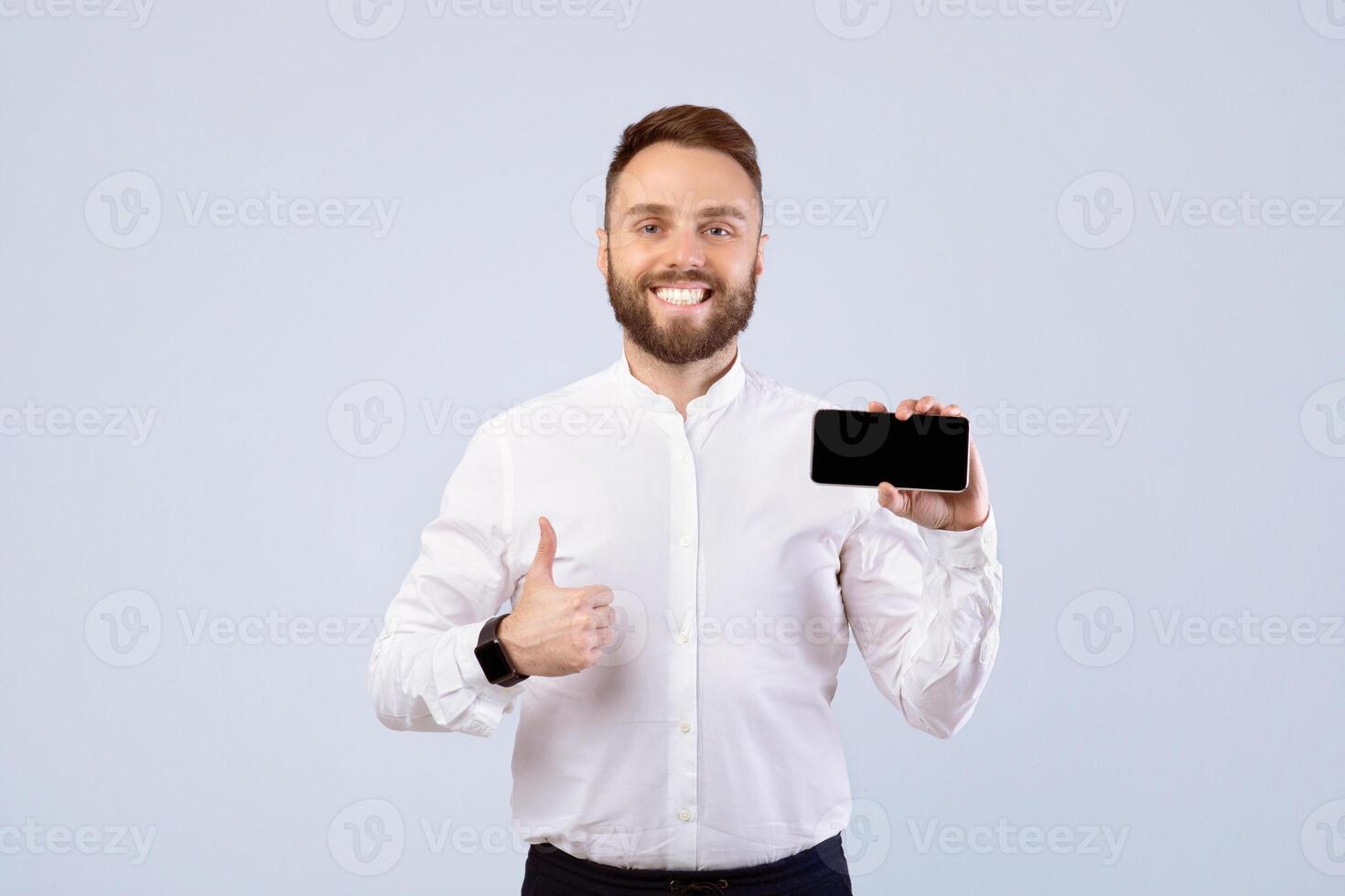 Cool bearded guy showing smartphone with empty screen and gesturing thumb up over grey studio background, copy space. Young man with mobile device, mockup for website or app design Pro Photo