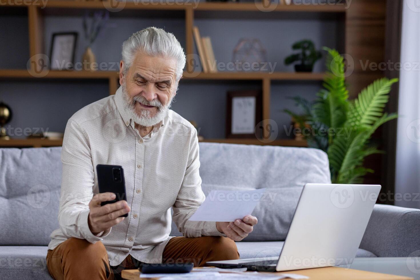Smiling senior gray-haired man sitting at home on the sofa in front of the table with a laptop, holding a notebook and using a mobile phone. Pro Photo